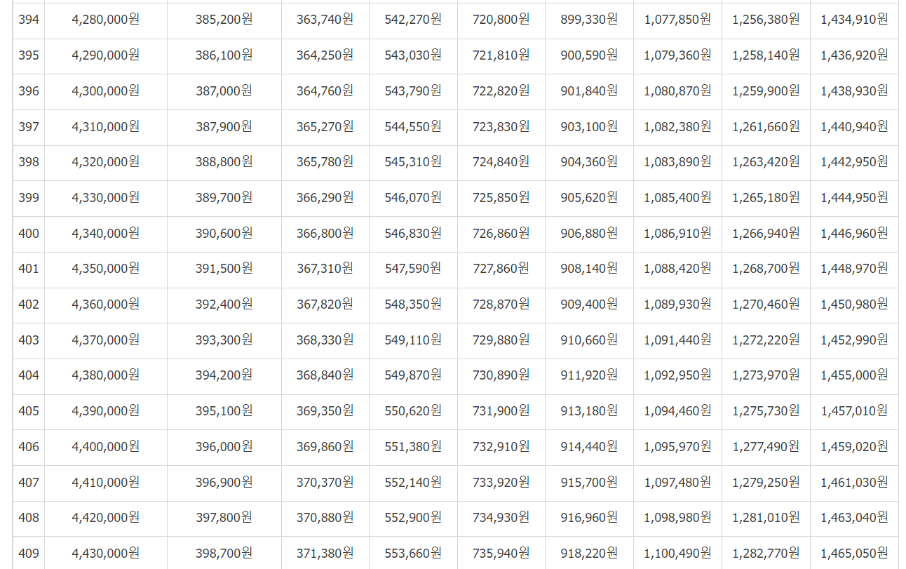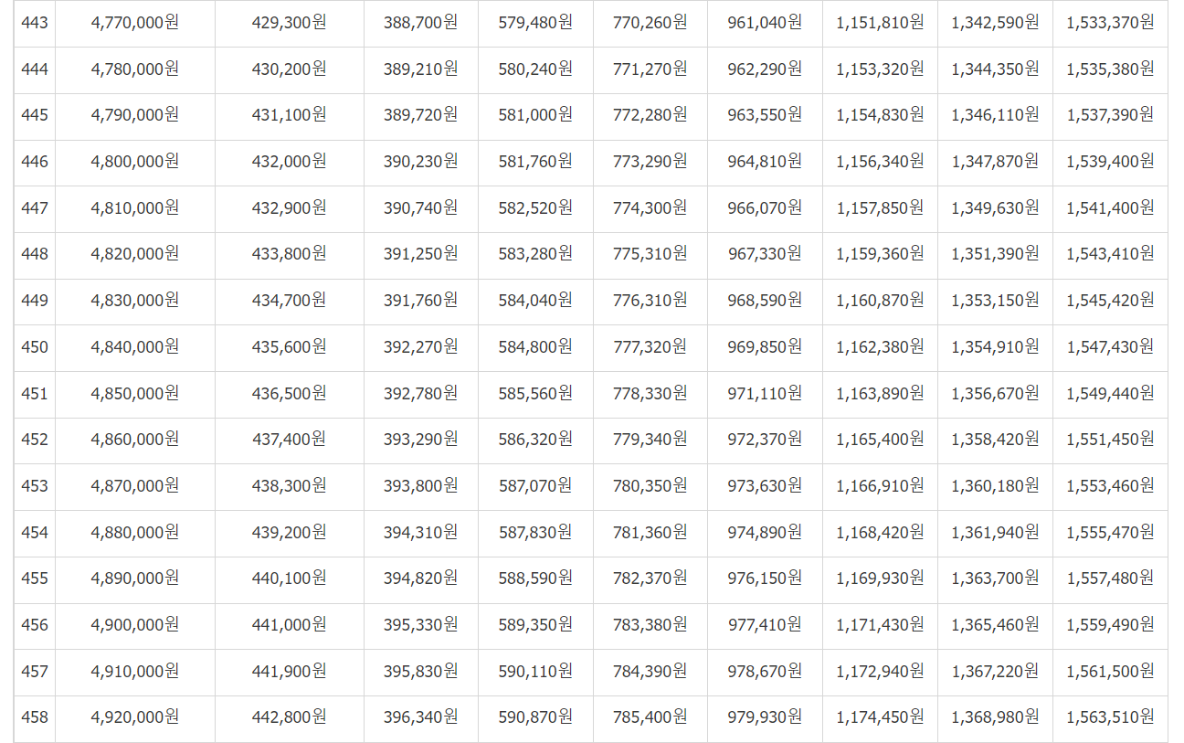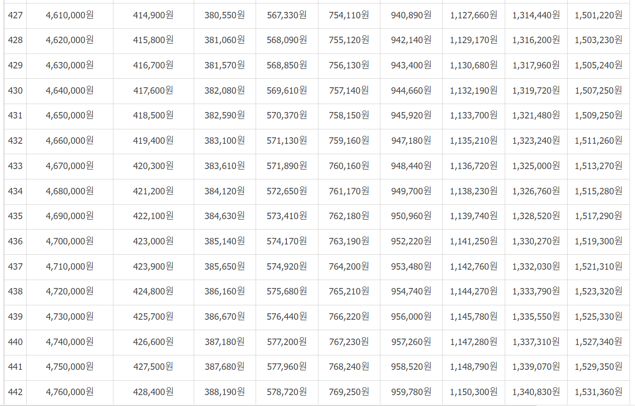 [연금보험료]를 보시고 (31,500 / 32,400... 497,700)에서 본인이 월마다 납부하는 보험료를 기준으로 금액을 찾습니다.