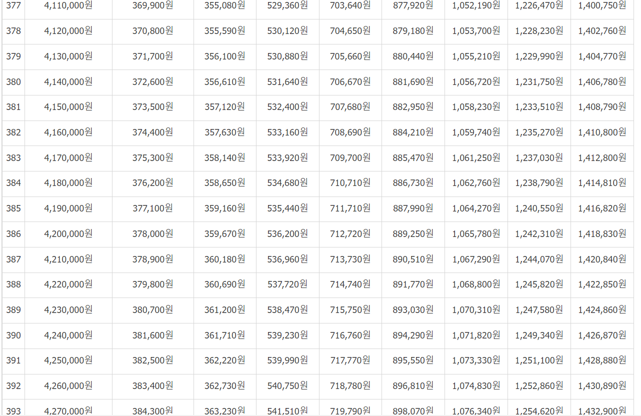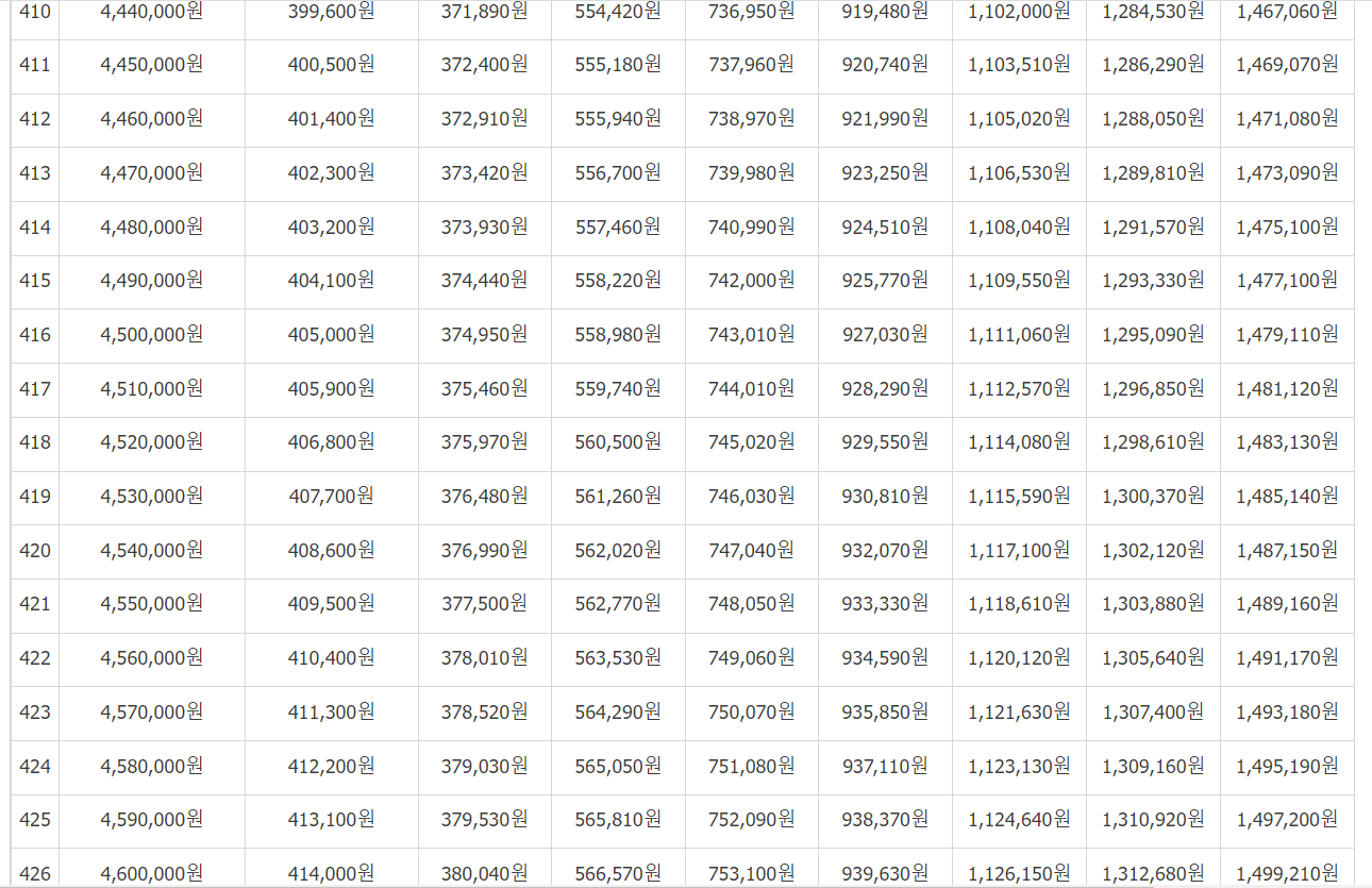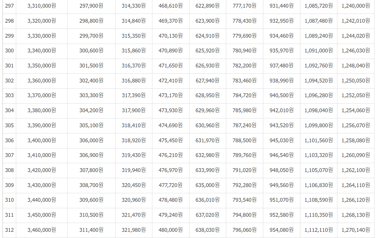 [연금보험료]를 보시고 (31,500 / 32,400... 497,700)에서 본인이 월마다 납부하는 보험료를 기준으로 금액을 찾습니다.