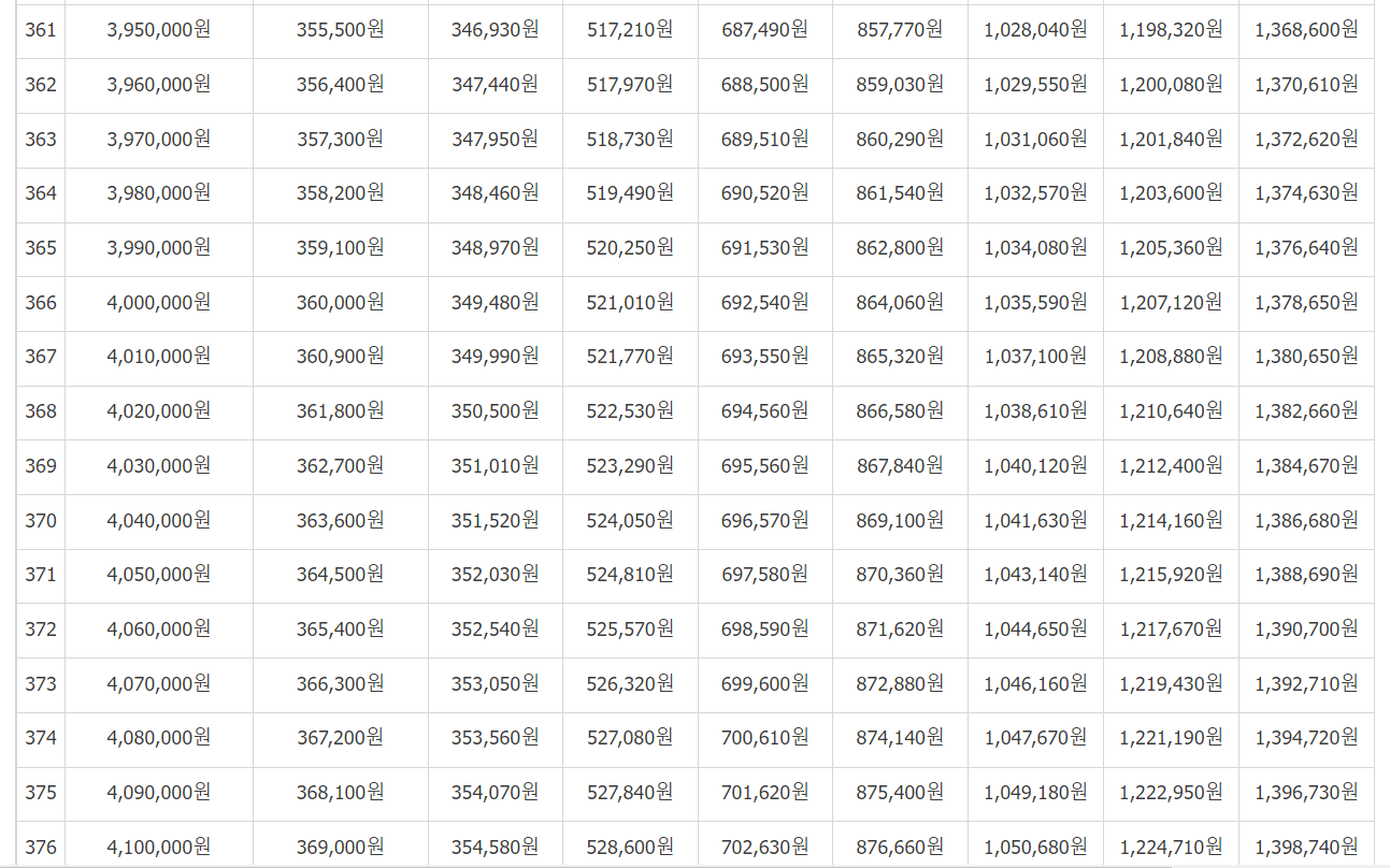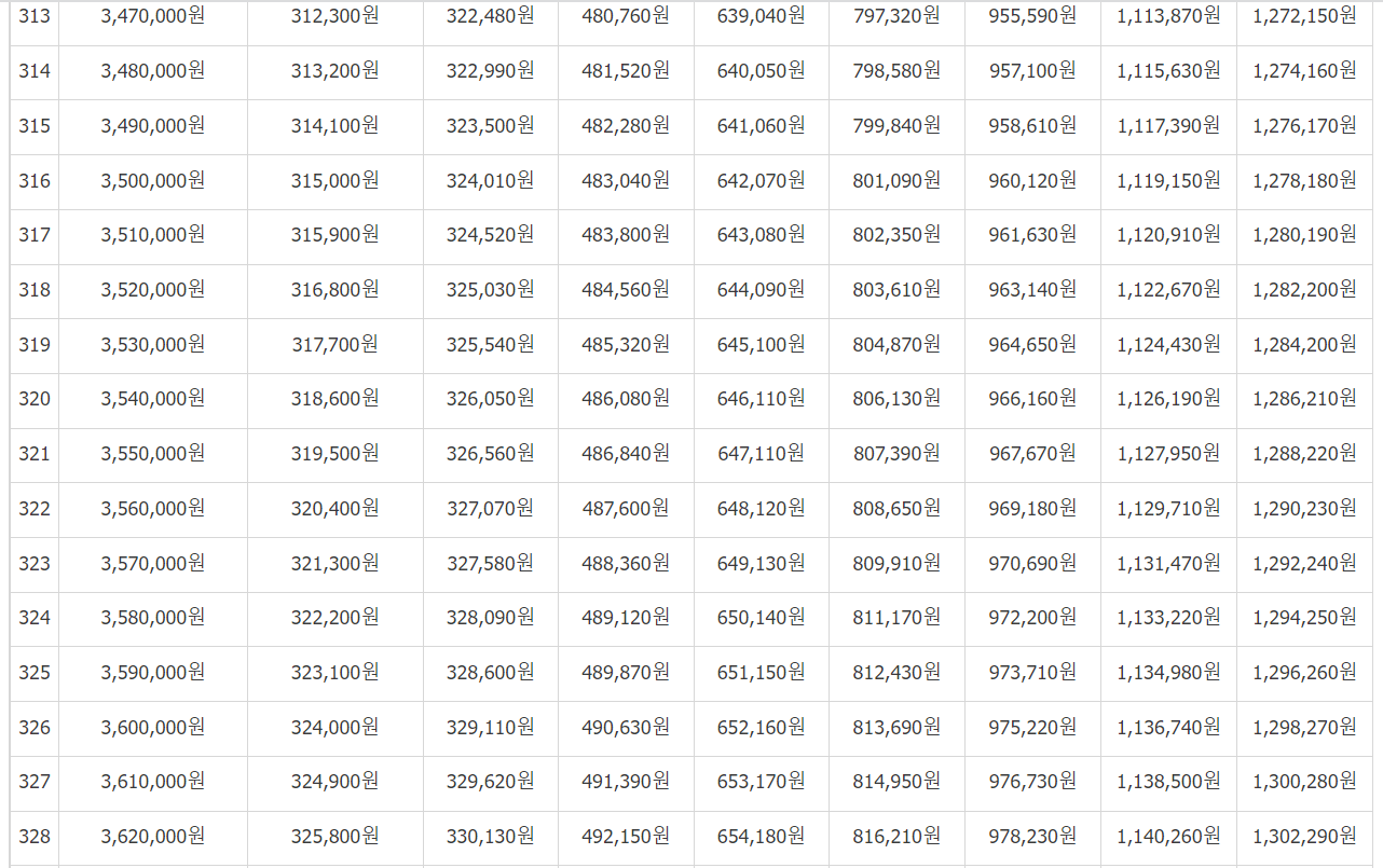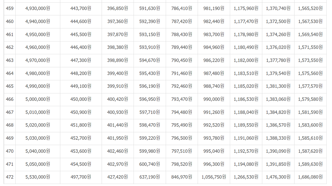 [소득월액 평균액]을 보시고 (35만 원, 36만 원... 553만 원) 본인의 소득월액 금액을 찾습니다.