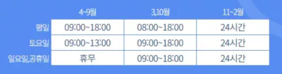 운영시간은 절기마다 차이가 있으므로 아래내용을 참고하시기 바랍니다.