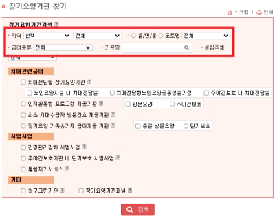 - 지역선택 > 급여종류(노인요양시설) > 검색