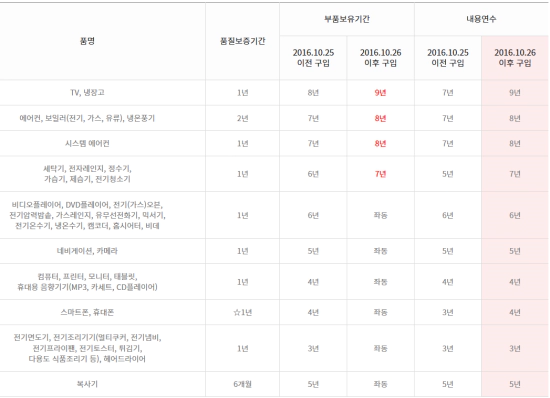 - 품질보증기간 1년: 냉장고, TV, 시스템에어컨, 세탁기, 전자레인지, 정수기, 제습기 등