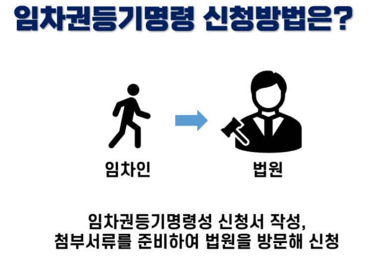 1. 임차권등기명령신청서를 작성하여 기명날인 또는 서명한 후 관련 첨부서류와 함께 임차주택의 소재지를 관할하는 지방법원·지방법원지원 또는 시·군 법원에 접수해야 합니다.
