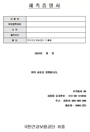 해촉증명서는 퇴직 시 이전에 근무했던 직장에서 발급받은 후 관할 국민건강보험공단 또는 국민연금공단에 제출하면 됩니다.
