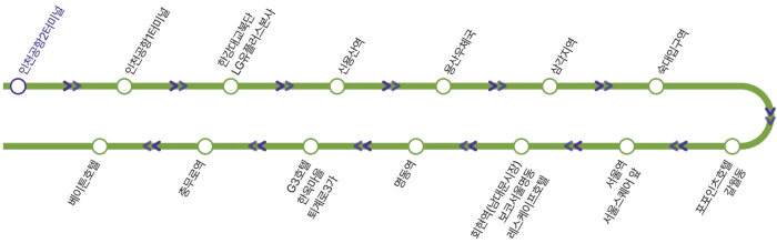 🚩서울시내 방향: 인천공항2터미널 > 인천공항1터미널 > 한강대교북단 LG유플러스본사 > 신용산역 > 용산우체국 > 삼각지역 > 숙대입구역 > 갈월동 포포인츠호텔 > 서울역 서울스퀘어앞 > 회현역(남대문시장) > 명동역 > G3호텔 한옥마을 퇴계로3가 > 충무로역 > 베이튼호텔