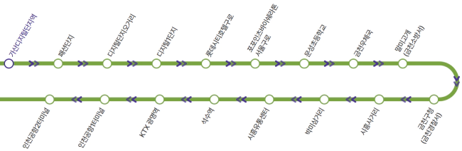🚩공항방향: 가산디지털단지역 > 패션단지 > 디지털단지오거리 > 디지털1단지 > 롯데시티호텔구로 > 포포인츠바이쉐라톤서울구로 > 문성초등학교 > 금천우체국 > 말미고개.금천소방서 > 금천구청(금천경찰서) > 시흥사거리 > 박미삼거리(국립전통예술중고) > 시흥유통센터 > 석수역 > KTX광명역 > 인천공항1터미널 > 인천공항2터미널